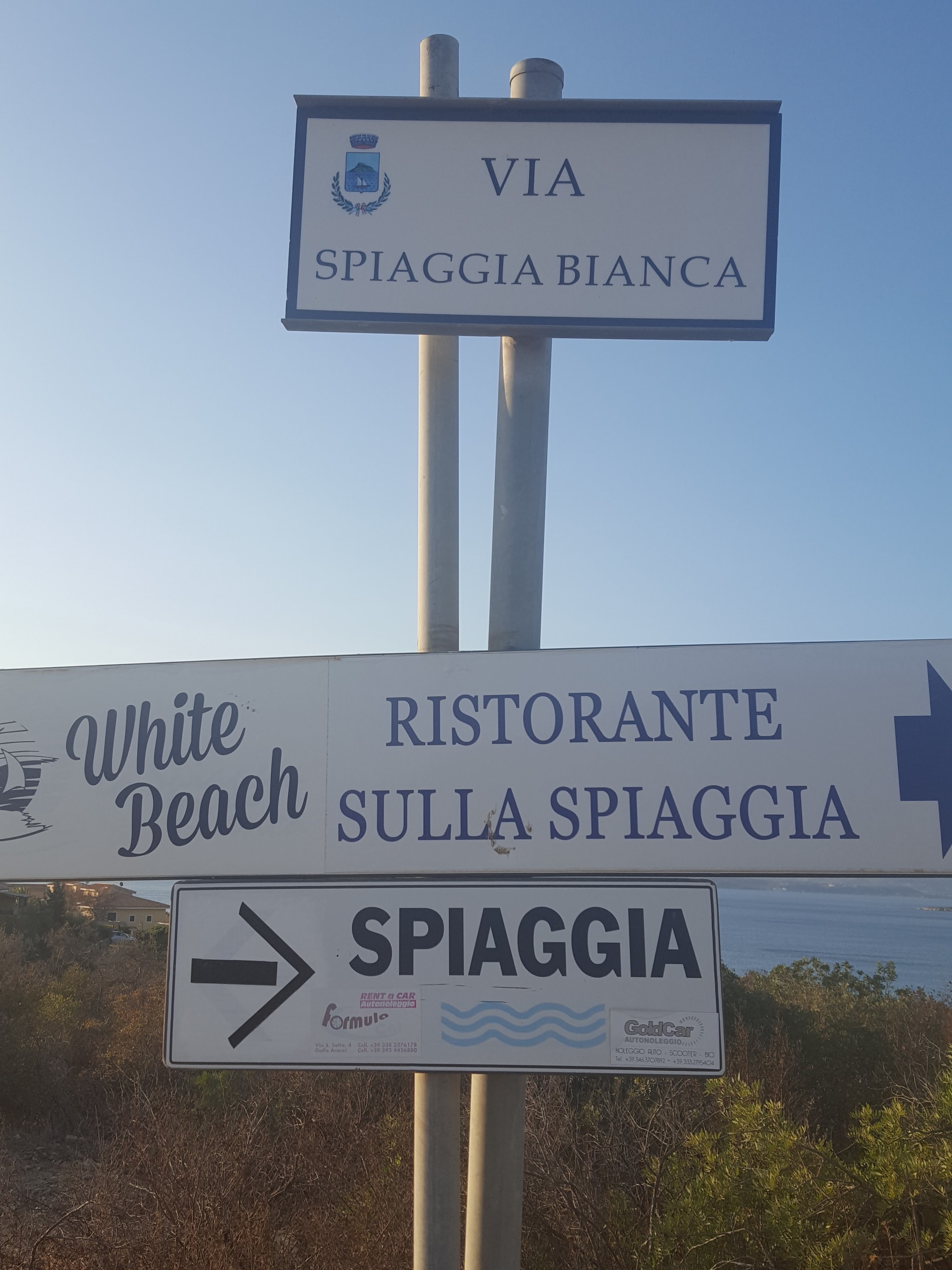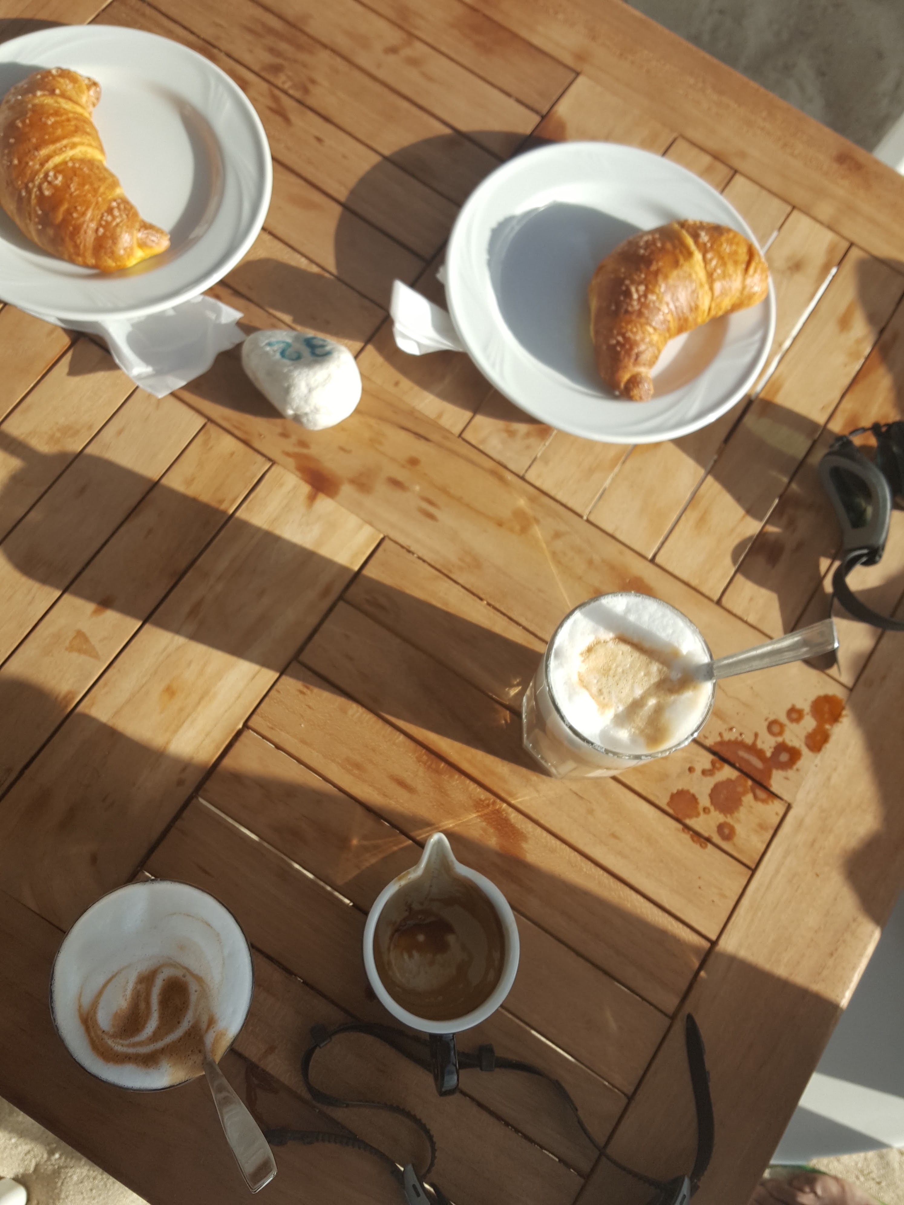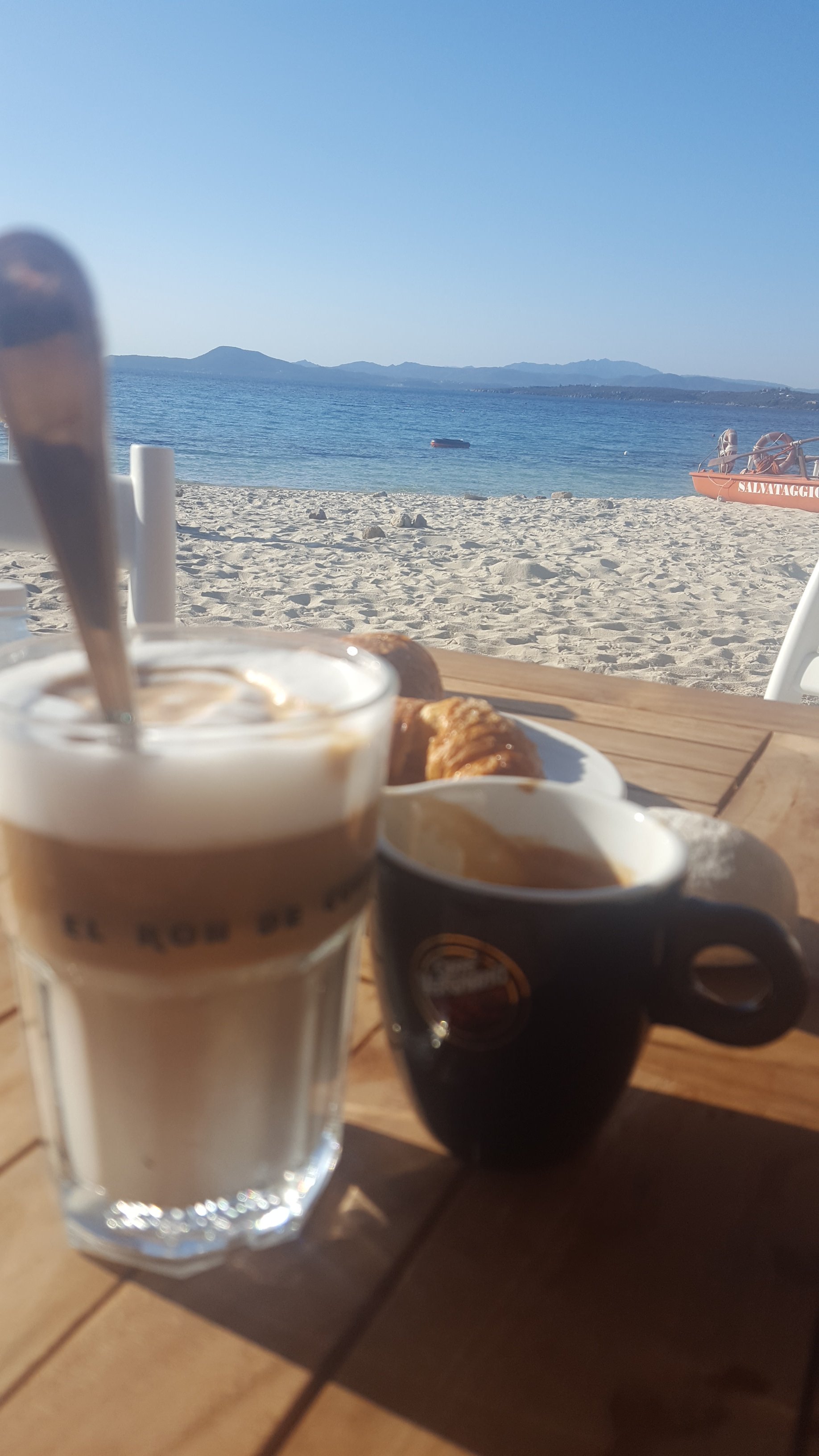 Best Spot den Tag zu starten: White Beach / Spiaggia Bianca, Cappuccino laktosefrei, Croissant gefüllt mit Aprikosenmarmelade, Sonne & Meer, Füsse im Sand …